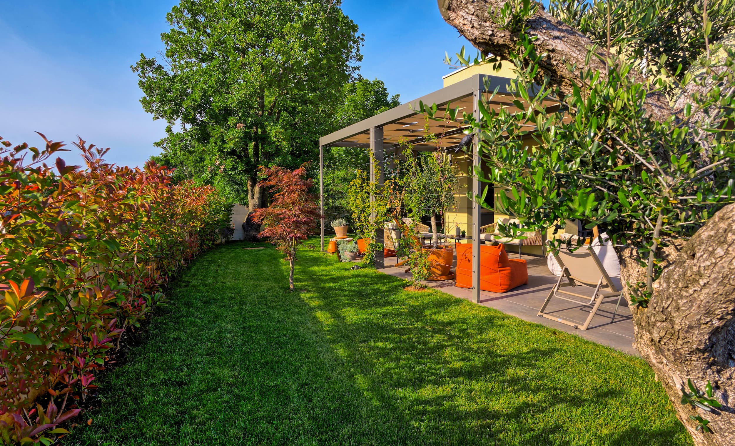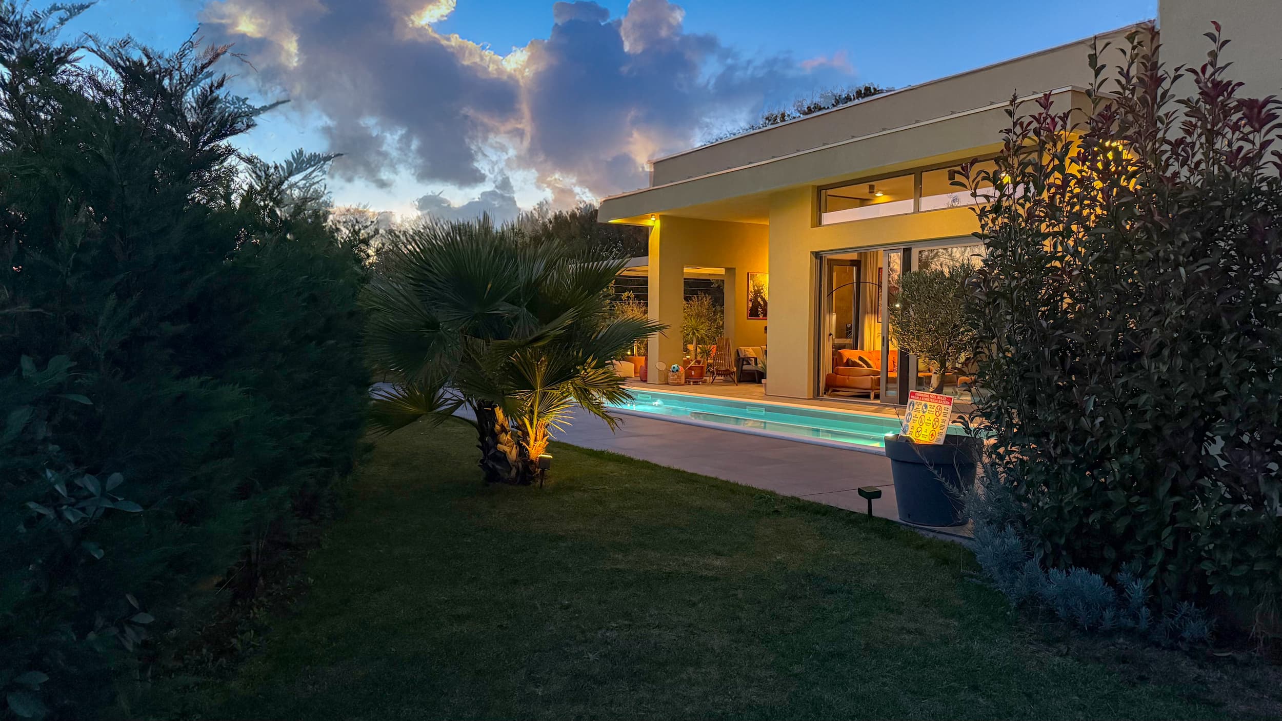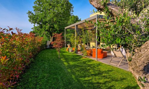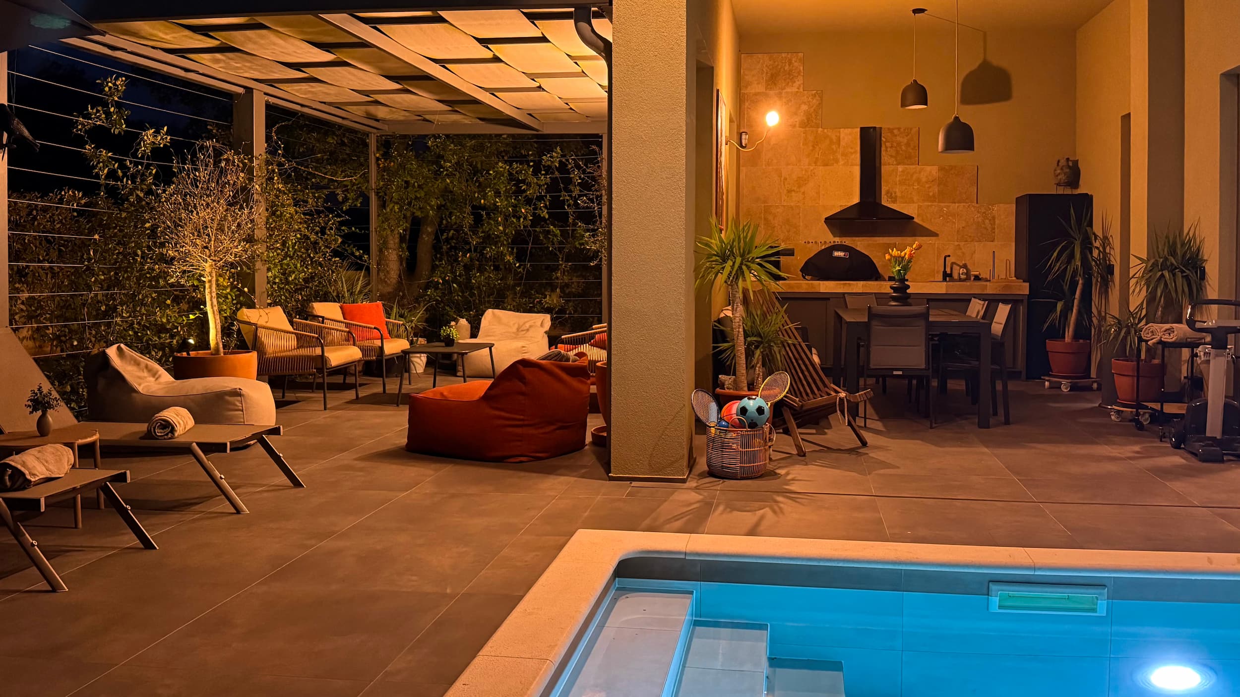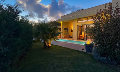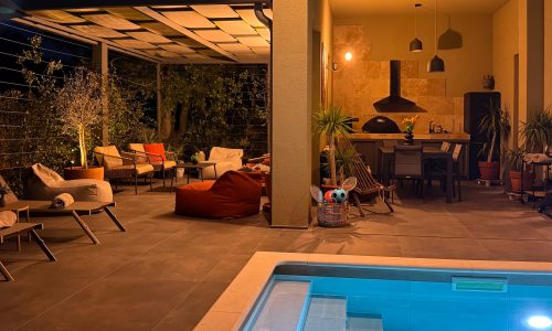 Our villa’s pool area features a 10×2,8 m pool surrounded by a beautifully nature, lined with comfortable deck chairs perfect for sunbathing. Adjacent to the pool is a charming pergola draped with climbing plants, offering a shaded retreat with cozy seating. The meticulously landscaped garden, filled with lush greenery, provides a tranquil and private atmosphere.